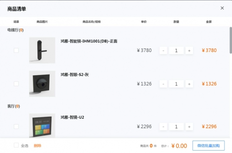 在鸿雁数字化样板间,不仅海量户型一键智能匹配,更有丰富的鸿雁智能家居产品池,轻松体验智能家居产品在不同场景中的应用。在设计时,用户可以查看具有人脸识别自动开门,执行专属回家场景的智能门锁;家中智能设备一屏掌控的玄关中控屏;能够实现无级调光调色的智能灯具等百余种智能家居产品。当看到喜欢的产品时,可点击查看商品的款式、细节、价格,如若看中,轻松加入购物车一键购买。