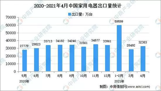 中国是全球最大的家电产能基地之一,2019年,我国家电行业的出口规模达3034亿元,同比微增0.9%。2020年新冠肺炎肆虐全球,海外居家生活时间延长,提升了海外市场对家电产品的需求。2020年我国家电行业的出口量达338997万台,同比增长14.2%;出口额达661.28亿美元,同比增长23.5%。最新数据显示,2021年1-4月我国家电行业的出口量达120480万台,同比增长45.9%;出口额达310.64亿美元,同比增长61.9%。