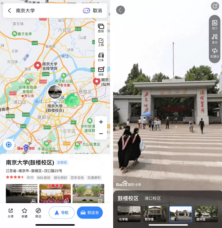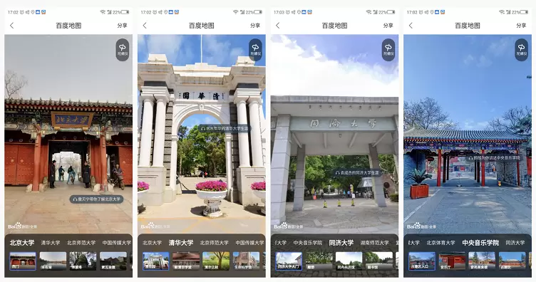 无论是校园地标、教学楼建筑、还是校内的自然风光,百度地图全景都“尽收囊中”。先通过定点拍摄、轨道拍摄等方式完成校园场景取材,后期再对素材进行加工处理,制作成360°全景图,更加真实地呈现出大学校园的风景风貌。目前,已覆盖全国超1000所高校,可为更多用户提供优质的线上校园游览服务,既能帮助准大学生们提前了解心仪学校,也为毕业生们提供了重温学生时代的全新方式。