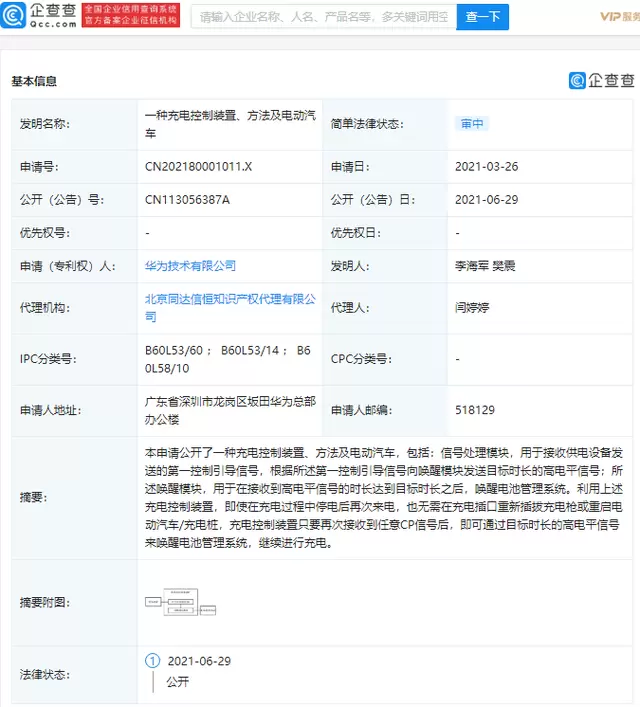6月30日下午消息,天眼查App显示,6月29日,华为技术有限公司公开“一种充电控制装置、方法及电动汽车”专利,公开号CN113056387A,申请日期为2021年3月。