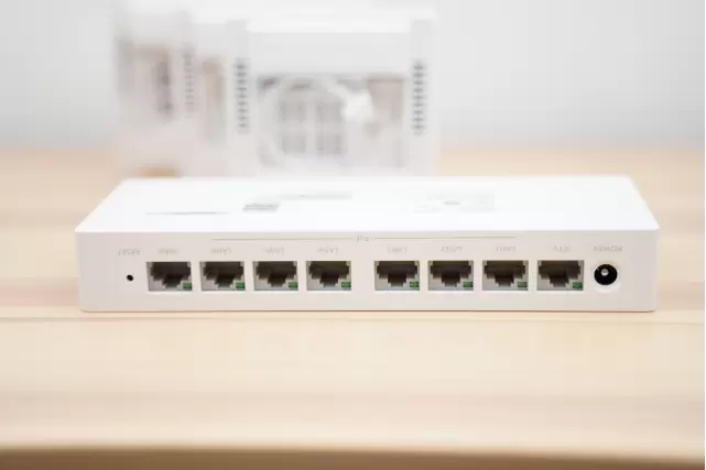 母路由只承担有线路由的功能,没有发射Wi-Fi的功能,支持PoE供电,有1个自适应的千兆WAN口、1个IPTV口(可看IPTV电视)、6个自适应千兆LAN口,应该直接安装在家里面的弱电箱中,通过之前预埋好的网线,将其他子路由连接在一起,共同组成全屋Wi-Fi网络,而每一个子路由就像是一个AP放大器,将信号发射在附近区域。