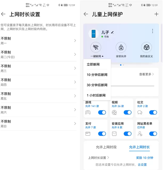 另外还有一个非常好的功能,那就是儿童上网保护,你可以通过华为智能生活App,对儿童上网的设备进行时长、游戏等管理,更好的帮助孩子上网,有效防止网络沉迷,有利于孩子的健康成长,而且操作很简单,操作界面也是一目了然。