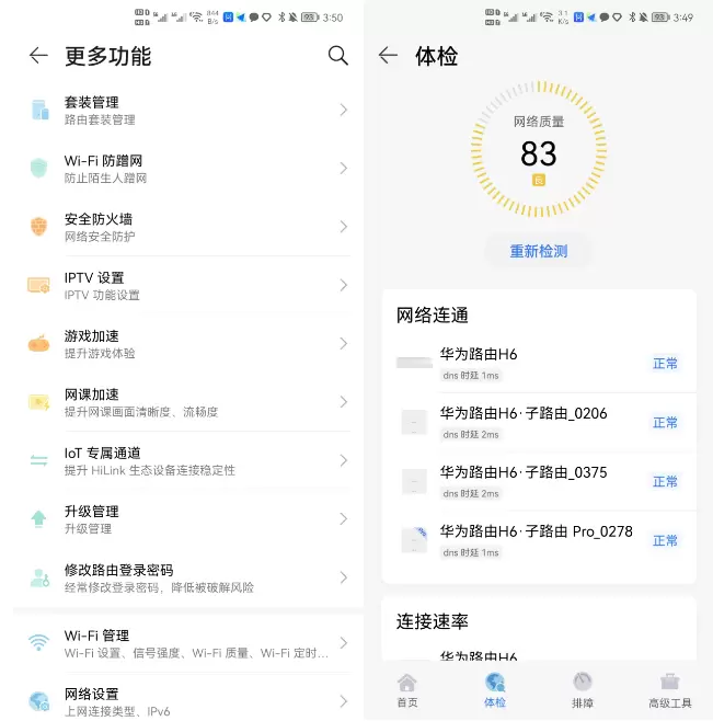 值得一提的是,就算遇到不明原因的断网问题,华为路由H6内置了维护和检测问题,系统会自动检查各个设备的工作状态,发现问题后会在智慧生活APP相关页面显示出来,然后用户可以选择相关方法解决问题,这样的体验非常不错,不需要用户首先去鼓捣设备,可以更便捷的先去用手机查看是哪里出问题。