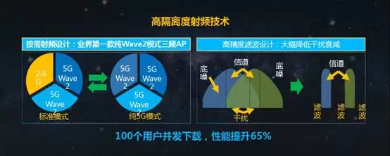 另一个是高隔离度射频技术。高密场景下,业内要么采取牺牲性能,要么牺牲覆盖范围来满足要求。而锐捷解决了这个问题,仪表级高精度滤波,大幅降低干扰。100位用户并发下载,20M文件仅需2秒,性能提高65%。