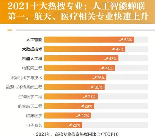 在2021年高考志愿填报之前,国内相关机构对于广大家长和考生的关注的专业进行了统计和分析,结果显示,今年人工智能专业仍然位居国内热搜专业首位,搜索热度同比提升了52%,增长趋势十分明显,大数据技术位居第二,机器人工程、物联网工程、计算机科学与技术等相关专业社会关注度也非常高,而过去比较热门的金融、国际经济与贸易、工商管理等专业均没有进入前十。