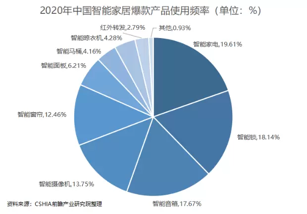 家庭安防的主要产品包括智能门锁、智能摄像机和智能安防传感器。在我国智能家居爆款产品的使用频率排名中,智能门锁在智能家居整体市场中排名第二,在家庭安防市场中排名第一,使用频率为19.61%。由此可见,在家庭安防中,智能门锁更受消费者的欢迎。