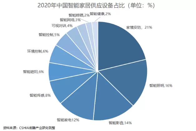随着时代和科技的发展,国家正大力推动新兴产业的发展,将互联网、大数据、人工智能等同各产业进行深度的融合。正是在这样的大趋势下,我国的家庭安防行业发展的如火如荼。从供应设备占比的数据来看,家庭安防市场份额占比为21%,排在了第一位。