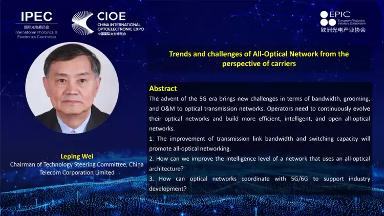 峰会的上半场围绕挑战光传输极限展开探讨。首先,中国电信集团公司科技委主任韦乐平从运营商的视角展望了未来网络发展的趋势。他认为未来网络会具备全光化、高容量、云化以及智能化等趋势特点;同时他也指出,全光网络会和5G/6G统筹发展,全光网络既是5G/6G的最佳承载方案,在接入端也是5G/6G的良性竞争者。在产业互联网场景下,全光网络和5G/6G各有侧重,5G/6G更适于移动场景;而对于固定场景,例如远程医疗,远程手术,光网络依然是更为稳定可靠的方案。