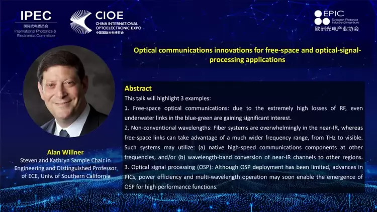 6月29日,由国际光电委员会(IPEC)和中国国际光电博览会(CIOE)联合主办,欧洲光电产业联盟(EPIC)协办的2021年全球光电子领域线上研讨会圆满召开,此次峰会主题为“释放光电潜能,推动标准和产业发展”,围绕高带宽、大容量光电通信技术以及热门的光电传感应用进行了深入的探讨和分享。本次活动云集了全球知名高校、顶级科研机构及光电产业上下游成员,它们包括:南加州大学、东京大学、华中科技大学、麦克马斯特大学、日本KDDILab、德国HHI、中国电信、海思光电以及Source Photonics等。