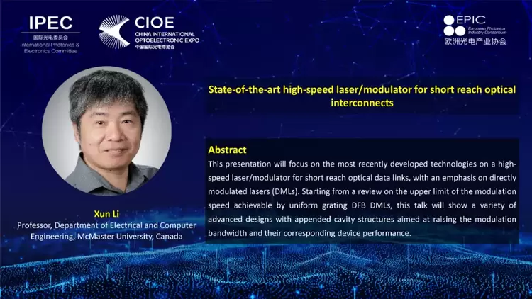 随着大容量数据中心应用的爆发,短距高速率的场景对光器件提出了更高的要求和挑战,来自加拿大麦克马斯特大学的李洵教授分享了关于高速激光器和调制器的研究进展,李洵教授指出目前多段架构的DML3dB带宽可以达到60~80GHz,可以满足100G NRZ和200G PAM4的需求,而晶体管激光器和自旋偏振调制激光器等新技术,可以将调制带宽提升到120~200GHz,这有望打破传统技术调制速率的瓶颈。