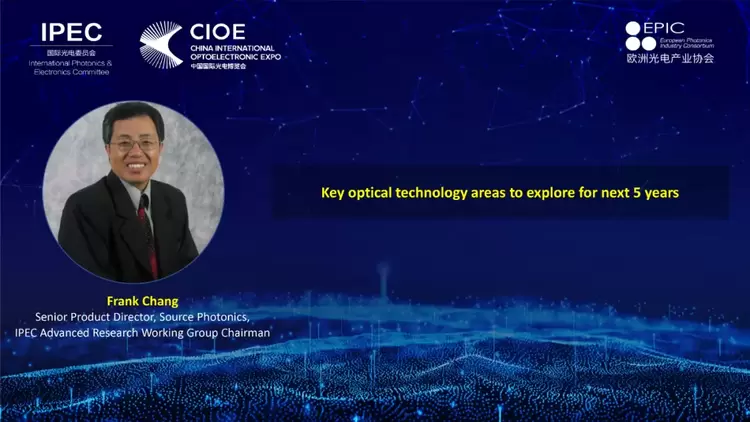 IPEC先进技术工作组主席、Source Photonics总工程师Frank Chang大会上分享了800G以及未来面向更高速率的CPO(Co-PackagedOptics)方案的最新进展,同时Frank也向大家展示了光电技术在激光雷达、激光显示以及传感等领域的应用,向现场听众展开了一张光电传感新应用的广阔蓝图。