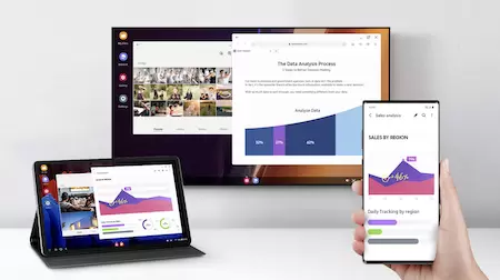 以三星DeX为例,无疑是希望手机成为移动工作站,不仅是可以投射到显示器,还可以投射到电视。该功能此前还依赖于通过有线的方式来输出屏幕信号,自三星One UI 2.5后,还新增了无线模式,再次提升了该功能的便捷性,连接成功后,手机屏幕则可以变身为触控板。此举无疑进一步降低了手机作为生产力核心后,对于外设的依赖程度。