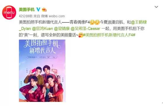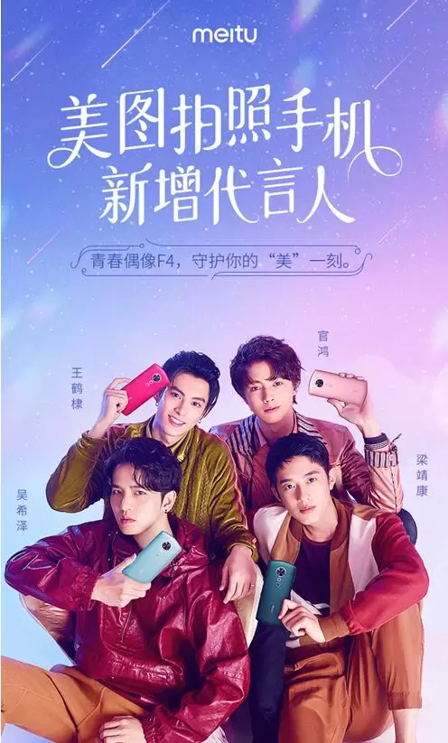 7月9日,美图手机官方微博宣布,新增4位品牌代言人:新版《流星花园》中的新F4王鹤棣、官鸿、梁靖康、吴希泽4位小鲜肉,未来他们将与国民女神Angelababy一起共同代言美图手机,而这也是美图手机首次新增男性代言人。