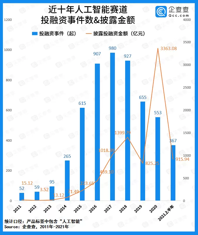 企查查数据显示,2021上半年人工智能赛道共发生融资事件367起,披露总金额超915.94亿元,其中融资事件数同比增长了63.1%。