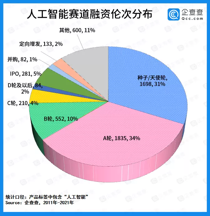 企查查数据显示,2011-2020年,人工智能赛道在种子/天使轮共发生1698起融资事件,占比31%;在A轮共有1835起融资事件,占比34%;在B轮共有522起融资事件,占比10%;在C轮共有210起融资事件,占比4%;在D轮及以后共有84起融资事件,占比2%;并购82起,占比1%。从融资轮次上来看,人工智能赛道的融资阶段集中在早期,占比近7成。