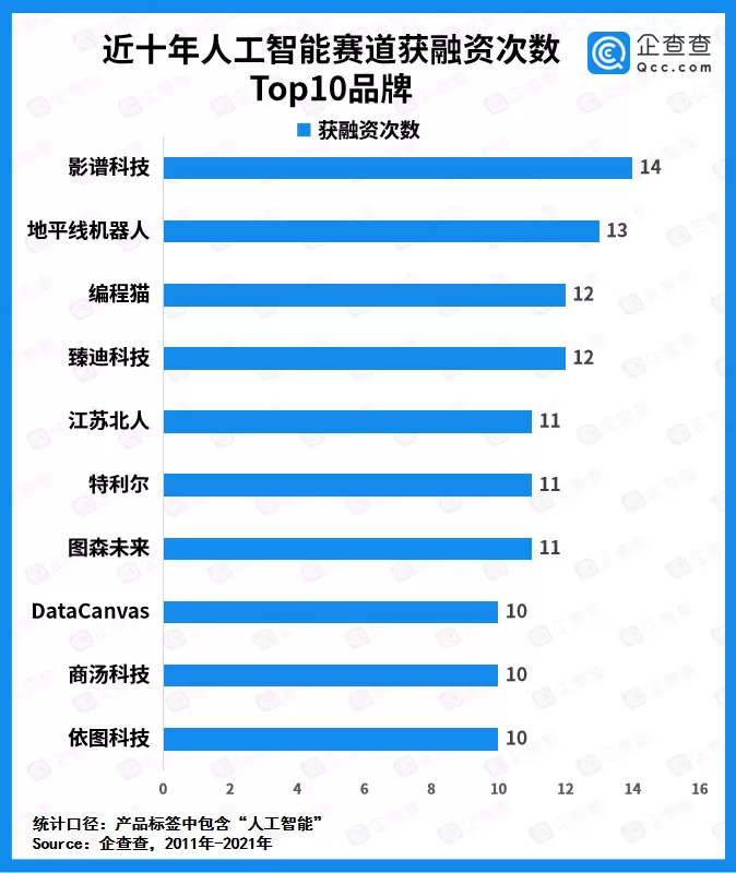 作为国内领先的智能影像生产技术商,“影谱科技”自2011年以来共计获得14起融资,总金额超304亿元人民币;其次是边缘人工智能芯片的全球领导者“地平线机器人”,共计获得13起融资,总金额超225.6亿元人民币;并列排第三的是“编程猫”和“臻迪科技”,二者均获得12起融资。