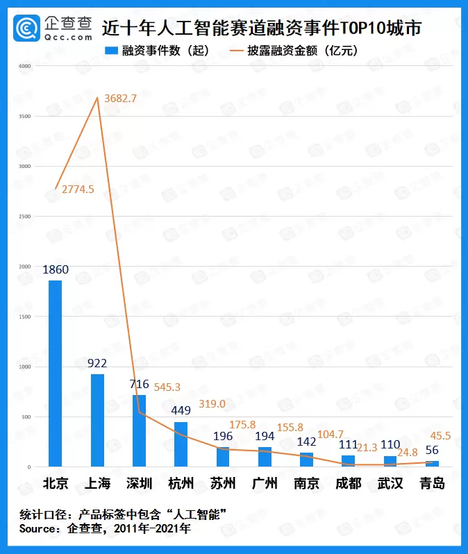 企查查数据显示,北京人工智能赛道近十年融资事件数达1860起,占比总量的34.0%,但披露融资金额却未超过魔都上海,上海近十年该赛道披露的融资金额超3682.7亿元,可以说是该赛道最吸金的城市。此外,深圳、杭州、苏州、广州、南京的披露投融资金额均达到了百亿级人民币。