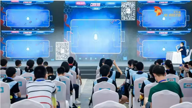 随着主持人和解说员的精彩评述,比赛也紧锣密鼓地开始,双方的战队实在地比拼起来。巨型屏幕上实时播放着程序对程序的比赛,实在是出人意料的精彩,AI智能代理程序和规则的相互作用,涌现出了令人刮目的智慧。程序“球员们”打得拼命,每球必争,小程序员选手们也如教练员一般,在台下认真讨论,好像在部署战术。观众们看得投入,欢呼声掌声此起彼伏。