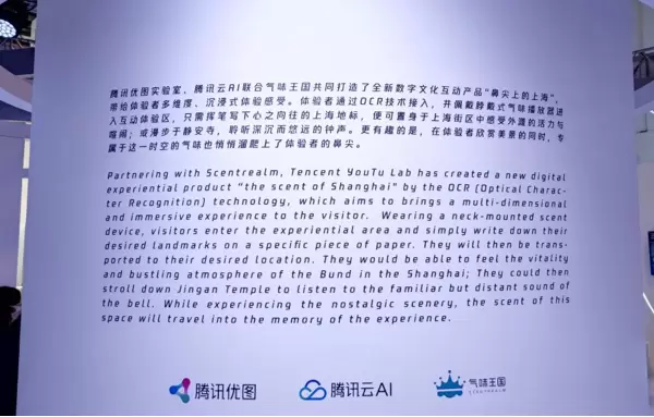 在展会上,气味王国与腾讯优图实验室、腾讯云AI共同打造的数字文化产品“鼻尖上的上海”为展区体验者打造了多维度、沉浸式的体验感受。体验者通过OCR技术接入,只需在手写板上写下上海的地理名称:静安寺、淮海路、人民广场……,佩戴的数字气味播放器就会释出与场景一一对应的气味,体验者在这沉浸的氛围中仿佛置身于美景之中。