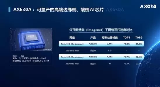 公开资料显示,爱芯科技自主研发的第一颗芯片AX630A是一款高性能、低功耗的人工智能视觉处理器芯片,功耗仅约3W,可实现57.6TOPS@800MHz 2w4f算力,等效算力达到28.8TOPS@800MHz INT4。不同网络下,AX630A每秒处理帧数分别为3116和1356,远超其他同类芯片产品,广泛用于智能摄像头、智能分析盒、智能加速卡、运动相机以及翻译笔等硬件设备。