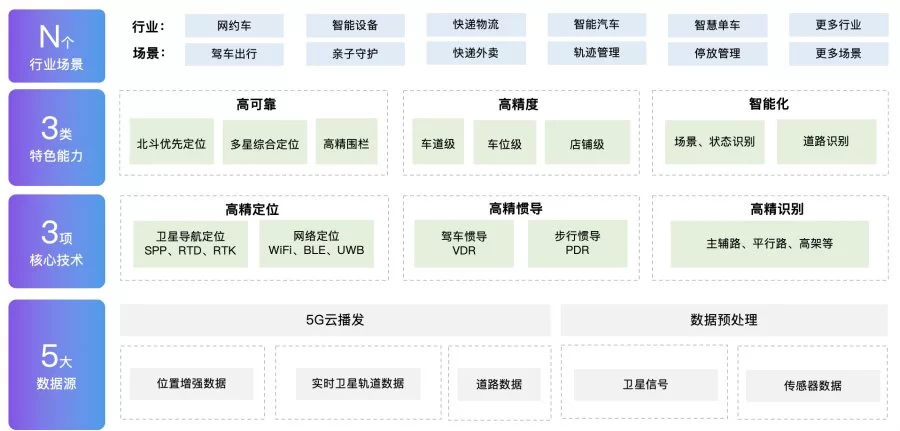 作为业内首家支持中国移动消费机手机精准定位系统的地图厂商,百度地图依托5G+北斗的低时延高精度特性,打造了基于5G位置增强的智能高精定位服务,构建了“5大数据源、3项核心技术、3类特色能力、N个行业场景”的服务生态。在数据方面,百度地图融合了位置增强数据、实时卫星轨道数据、道路数据、卫星信号、传感器数据五大数据源,打造了端云融合的服务能力,可在实际应用场景下实现毫秒级传输效率。同时,通过“5G+北斗+AI 技术”融合,百度地图在高精定位、高精惯导、高精识别这三项核心技术上实现重大突破,为用户持续提供专业稳定的位置服务。当前,百度地图高精定位技术突破手机的定位瓶颈,实现车道级定位精度。在此基础上,百度地图构建了高可靠、高精度、智能化的定位服务能力,并面向多元场景不断升级,为多个行业应用及生态服务赋能。