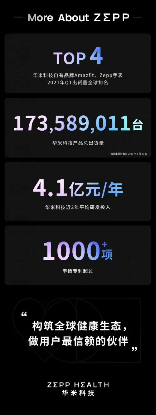 华米科技这家成立近八年的企业,已然成为全球可穿戴领域“头部玩家”。数据显示,今年 Q1,华米科技智能手表出货量已经跻身全球TOP4;截至今年3月31日,华米科技在全球累计出货了超过173589011台健康设备,为全球多个国家和地区的用户提供健康服务。