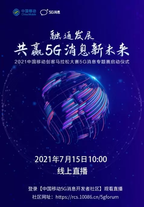 专题赛启动仪式将于7月15日上午10点进行线上直播,可登录中国移动5G消息开发者社区预约观看。