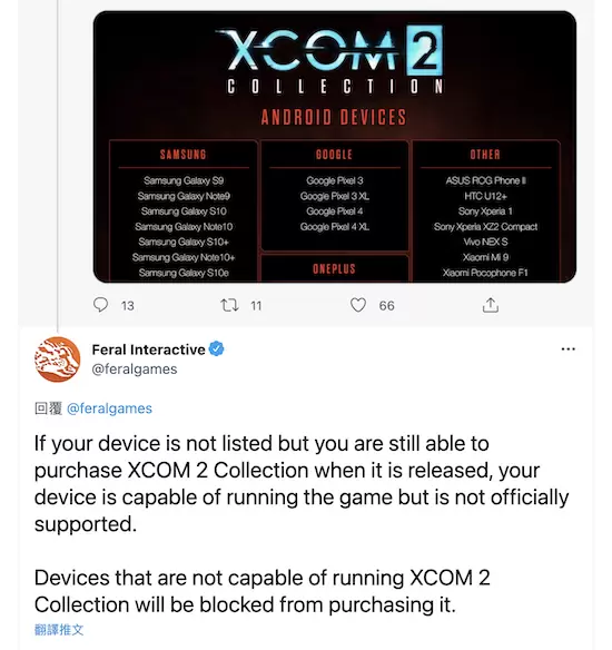 在这款游戏公布的Android机型列表中,更是直接对不少在售型号宣布了“不能玩”。其中如Google在售的旗舰机型Pixel 5,而Pixel 4系列则可以支持这款大作。这家游戏公司还在推特上专门说明称:“如果玩家的设备没有在列表中,若能够在XCOM 2 Collection发布时购买,表明该设备能够运行游戏,但不被官方支持。而不能够运行XCOM 2 Collection的设备将被阻止购买。”