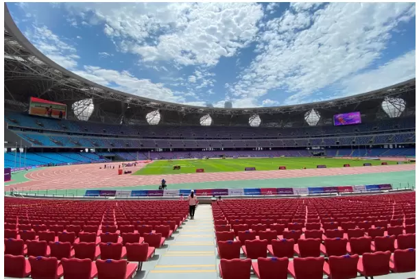 走进场馆,红彤彤的赛道,绿茵茵的草地,气势恢宏的亚运主场馆可以容纳8万多人,场馆内的看台斜度,根据人体视线标准进行调整,能让观众拥有最佳观赛体验。