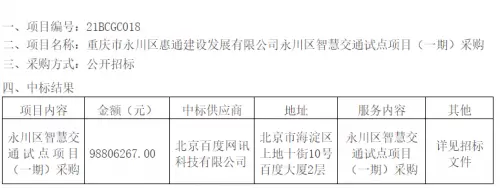 7月12日,重庆市永川区对外公示,百度中标永川区智慧交通试点(一期)项目,项目金额9880万元,采购人为重庆市永川区惠通建设发展有限公司。