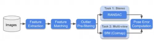 本次比赛的评测机制如图2所示,参赛者根据自己提出的方法提取每张图的关键点和对应描述子,并提交每两张图之间的匹配结果,赛方会根据提交的结果统计两种评估方案:1.通过对比两张图之间匹配结果对应的相机位姿和真实位姿之间的差异(Stereo)。2.根据多张图之间的关键点匹配结果,统计重建后预测全图的相机位姿和真实位姿之间的差异(Multi-view)。因此对于任意两张图之间,关键点的分布越分散,匹配的点越准,则位姿估计的效果越好。