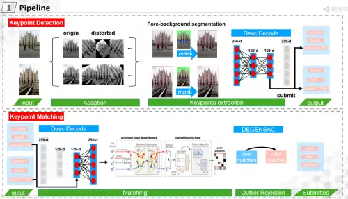 此外,本届比赛分为限制性赛道(Restricted category)和非限制性赛道(Unlimited category),其中限制性赛道要求参赛者提交有限的关键点和对应描述子,非限制性赛道可提交不限数量的关键点对和对应描述子。相较于前两届比赛,本届比赛增加了街景和公园等场景,图片之间的角度和尺度变换更大,对算法挑战非常大,因此我们同时针对关键点的提取部分和匹配准确度部分都做了相应的改善,具体思路如下: