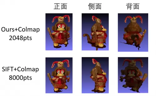 视觉图像匹配作为基础的计算机视觉能力,在其基础上可拓展众多的下游任务。如在图像检索中,可以通过image matching来检索到和Database中相似的图片,如图8所示。在SFM(Structure from motion)中,可以通过关键点匹配来获取摄像头外参并结合内参进行深度估计并重建出拍摄物体(如图9所示)。在图像跟踪与配准中,通过前后帧的匹配可以捕捉视频的运动轨迹,并针对目标物体进行视频跟踪与图像配准。