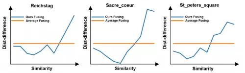 我们针对输入图片进行随机变换增加了提取到的关键点对尺度变换的鲁棒性,同时提出了针对描述子的特征融合模块,以提升描述子的表达能力和尺度鲁棒性。同时我们还对比了我们的特征融合和平均特征融合的效果,其中横坐标为描述子的cos相似度,纵坐标为二者的分布差异,可见我们的方法在高相似度区域下的占比明显高于平均特征,而在低相似度区域下的占比明显低于平均特征,验证了我们方法的有效性。