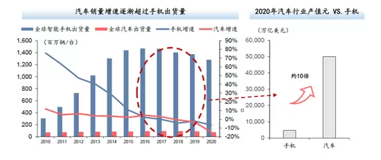 图2:全球汽车市场和手机市场规模比较,资料来源::IDC,华泰证券