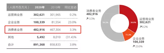 根据华为2020年的年报,华为所有业务收入8913亿元,增速仅为3.8%。其中消费者业务收入4829亿元,增速从2019年的34%骤降到3.3%,增长动能几乎断崖。