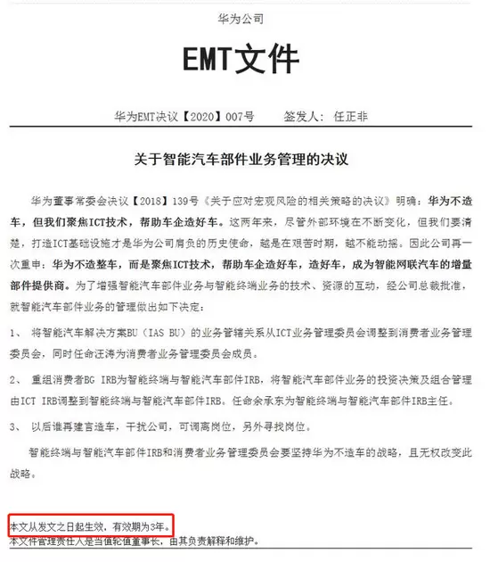 华为一直重申“不造车”,暗示着华为要做车企的“朋友”而不是“竞争对手”,解除众多车企的防范心理,吸引更多的朋友。然而,在文件的末尾,又写着“本文从发文之日起生效,有效期为3年”。