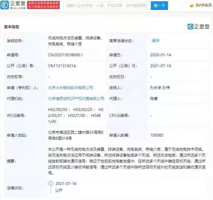 企查查APP显示,7月16日,北京小米移动软件有限公司公开“无线充电方法及装置、终端设备、充电系统、存储介质”专利,公开号为CN113131621A。