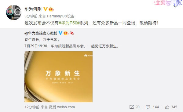 7月19日消息,华为终端官方微博正式宣布,将于7月29日19点30分举行旗舰新品发布会。随后华为消费者业务首席运营官、华为消费者业务手机产品线总裁何刚转发微博并表示,这次发布会不仅有华为P50系列,还有众多新品一同登场。