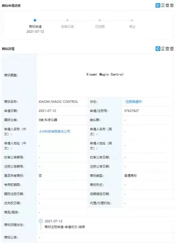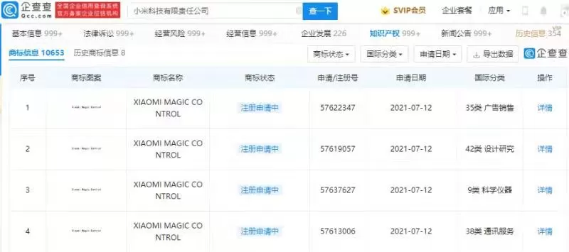 企查查APP显示,近日,小米科技有限责任公司新增多项“XIAOMI MAGIC CONTROL”商标申请信息,国际分类涉及广告销售、设计研究、科学仪器、通讯服务,目前商标状态均为“注册申请中”。