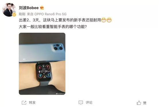 值得一提的是,OPPO中国区总裁刘波(Bobee)也在19日发微博暗示:“出差2、3天,这块马上要发布的新手表还挺耐用”,看来新品的续航肯定是超过3天了。要知道,智能手表因为体积比较小,所以电池容量有限,而屏幕和高性能处理器的消耗又很大。因此,如何延长续航时间,就成为智能手表行业长期以来难以突破的痛点。
