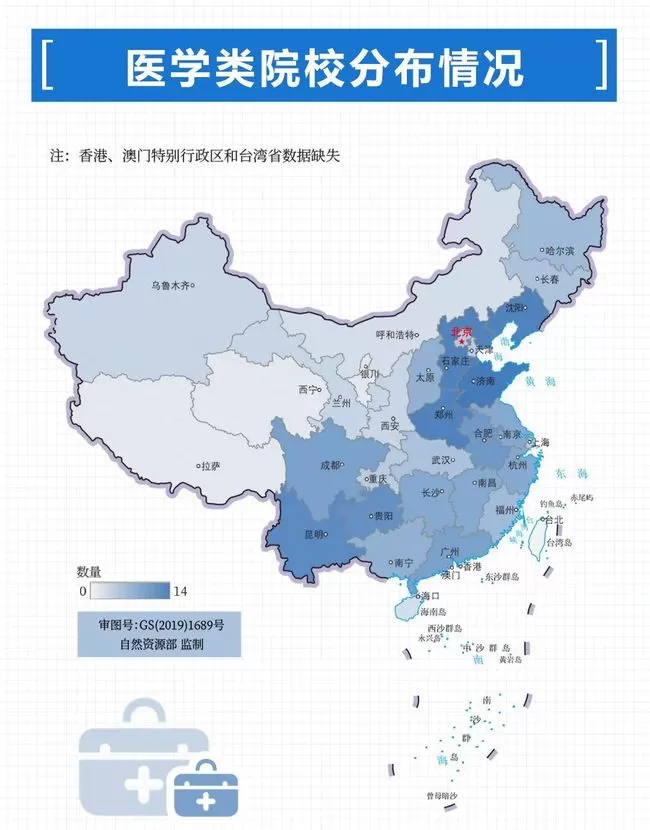 从地区看,上海、北京拥有医学A类学科的高校数量位居第一、第二位,领先于其他地区。而山东拥有最多的医学类院校,河北、河南、辽宁、云南等紧跟其后。