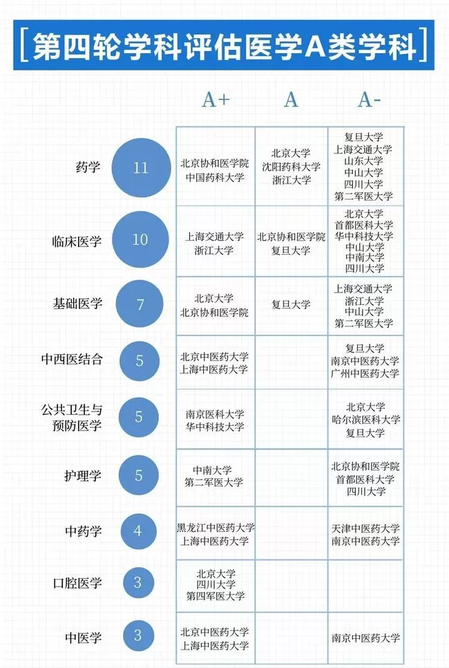 在教育部第四轮学科评估中,我国共有9个医药类学科入选A类学科。从高校看,共有23所高校开设的医学类专业被评为A类。其中,既有北京大学、复旦大学、浙江大学等综合类大学,也有北京协和医学院、首都医科大学等医学类院校。作为我国医学教育领域的排头兵,这些高校为我国输送了一批又一批优秀的医疗人才。