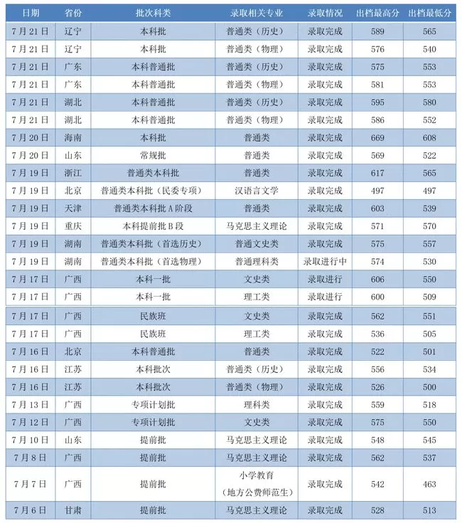 据报道,广西师范大学今年普通文史类投档最高分为606分,最低分为550分,理工类投档最高分为600分,最低分为509分,普通文史类和理工类投档最低分数线分别高于一本控制线20分和22分。