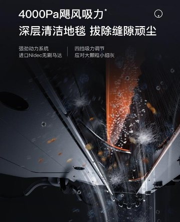 4000Pa飓风吸力,灰尘污垢一吸即净