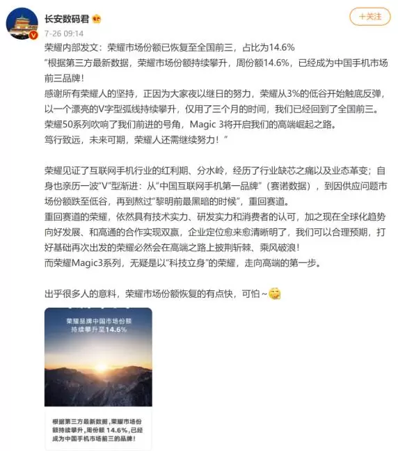 在6月份举行的荣耀50系列发布会上,赵明曾向人们展示了一条巨大的“V”形曲线:荣耀手机国内市场份额最高时达到了16.7%,排名第二;受众所周知的因素影响,2021年4月跌至3%,被业界称为荣耀的“至暗时刻”;5月份出现转机,荣耀份额回升至9.5%。如今,以14.6%的市场份额荣耀归来,位列全国前三。有研究机构预计,随着供应链调整到位和超高端旗舰荣耀Magic3系列的问世,荣耀手机下半年有望在国内赢得16%-20%的市场份额,重回行业巅峰!