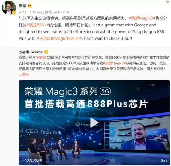 每年8、9月份都是各大手机品牌发布年度旗舰产品的时间,上半年蓄势待发的荣耀也将迎来自己的高光时刻。不久前,荣耀正式宣布将在8月12日发布荣耀Magic3系列,这将是全球首批搭载骁龙888+芯片的智能手机之一。与其它采用骁龙芯片的手机厂商不同,荣耀拥有雄厚的研发团队,能够在芯片和硬件底层进行深度优化。荣耀产品线总裁方飞曾表示,同样的芯片,荣耀有实力将其优化到比其他厂商高出10%到15%的水平。与此同时,荣耀已经将自研的GPUTurboX和LinkTurbo技术融入到骁龙平台上,前者可以大幅度提升手机的游戏表现,后者则可以确保手机信号和功耗的优良表现。荣耀Magic3系列必然会是市场上最好用的骁龙888+产品。关于这一点,高通CEO安蒙也高度肯定,荣耀Magic3系列凭借突出的芯片优化能力,将“充分”释放骁龙888+性能优势,期待早日体验。