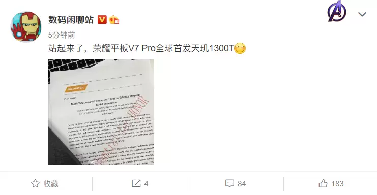 除了发布日期,荣耀新平板的配置同样也引发了人们的猜测。不久前网上曾出现了有关荣耀新平板芯片的爆料,知名爆料博主@数码闲聊站 称“站起来了,荣耀平板V7 Pro全球首发天玑1300T”。这颗芯片是联发科专为平板打造的旗舰级芯片。但这条爆料发布不久便被删除,真实性也无从考究。