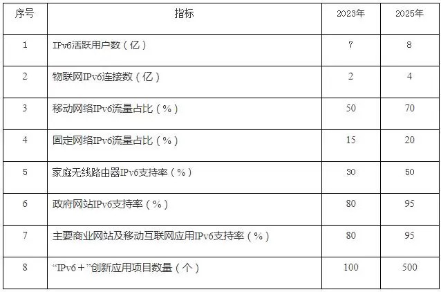 《通知》要求,到2023年末,基本建成先进自主的IPv6技术、产业、设施、应用和安全体系,形成市场驱动、协同互促的良性发展格局,IPv6活跃用户数达到7亿,物联网IPv6连接数达到2亿。移动网络IPv6流量占比达到50%,城域网IPv6流量占比达到15%。到2025年末,全面建成领先的IPv6技术、产业、设施、应用和安全体系,IPv6活跃用户数达到8亿,物联网IPv6连接数达到4亿。移动网络IPv6流量占比达到70%,城域网IPv6流量占比达到20%。之后再用五年左右时间,完成向IPv6单栈的演进过渡,IPv6与经济社会各行业各部门全面深度融合应用。