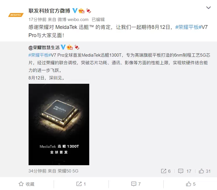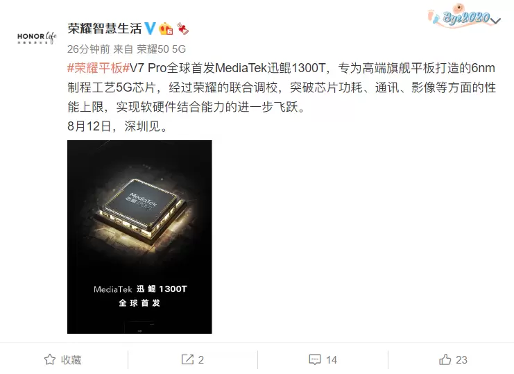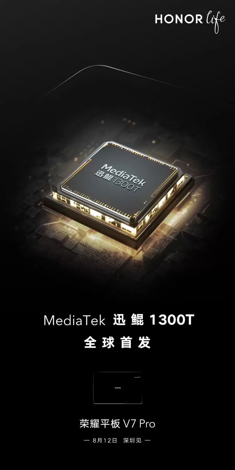 7月27日,荣耀官博@荣耀智慧生活 宣布:荣耀平板V7 Pro全球首发MediaTek迅鲲1300T,专为高端旗舰平板打造的6nm制程工艺5G芯片,经过荣耀的联合调校,突破芯片功耗、通讯、影像等方面的性能上限,实现软硬件结合能力的进一步飞跃。8月12日,深圳见。